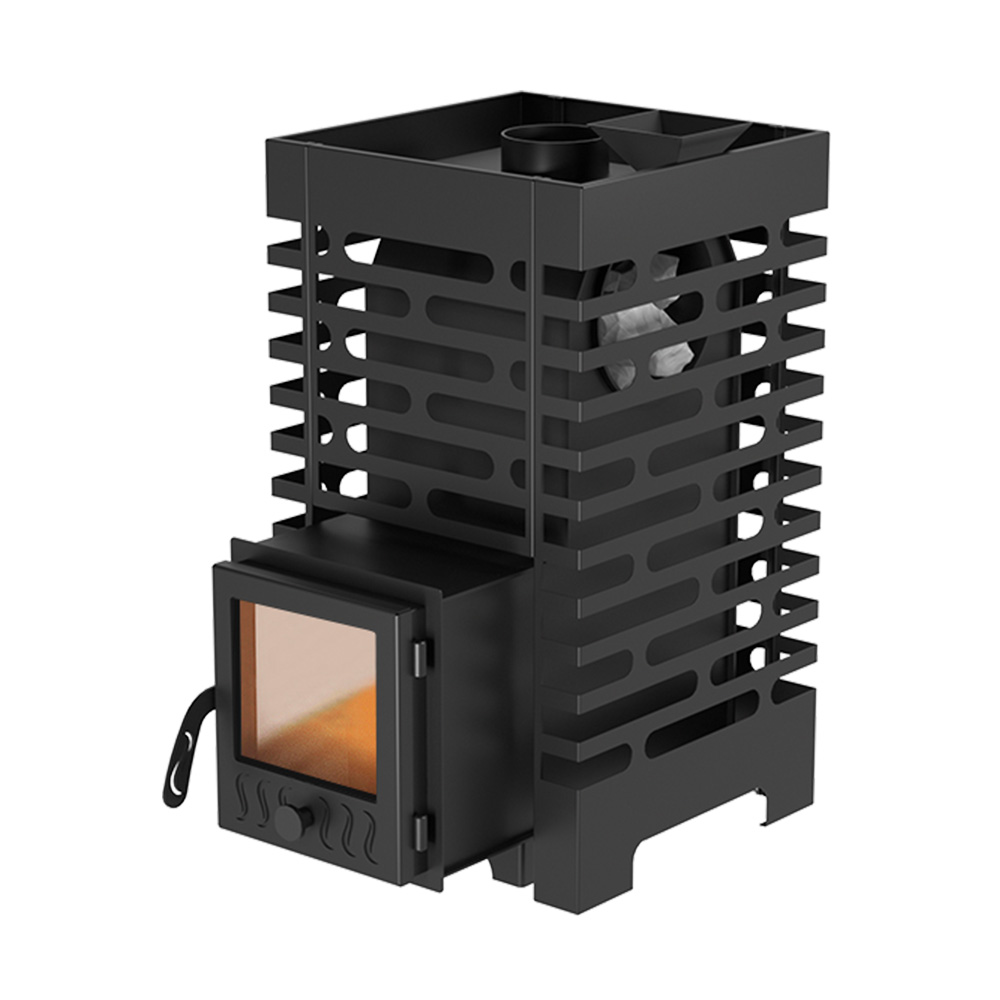Глубокая невентилируемая каменка-труба из стали 09Г2С толщиной 4 мм прогревается открытым пламенем для максимального нагрева камней, заложенных в нее и выполняет роль пламегасителя.