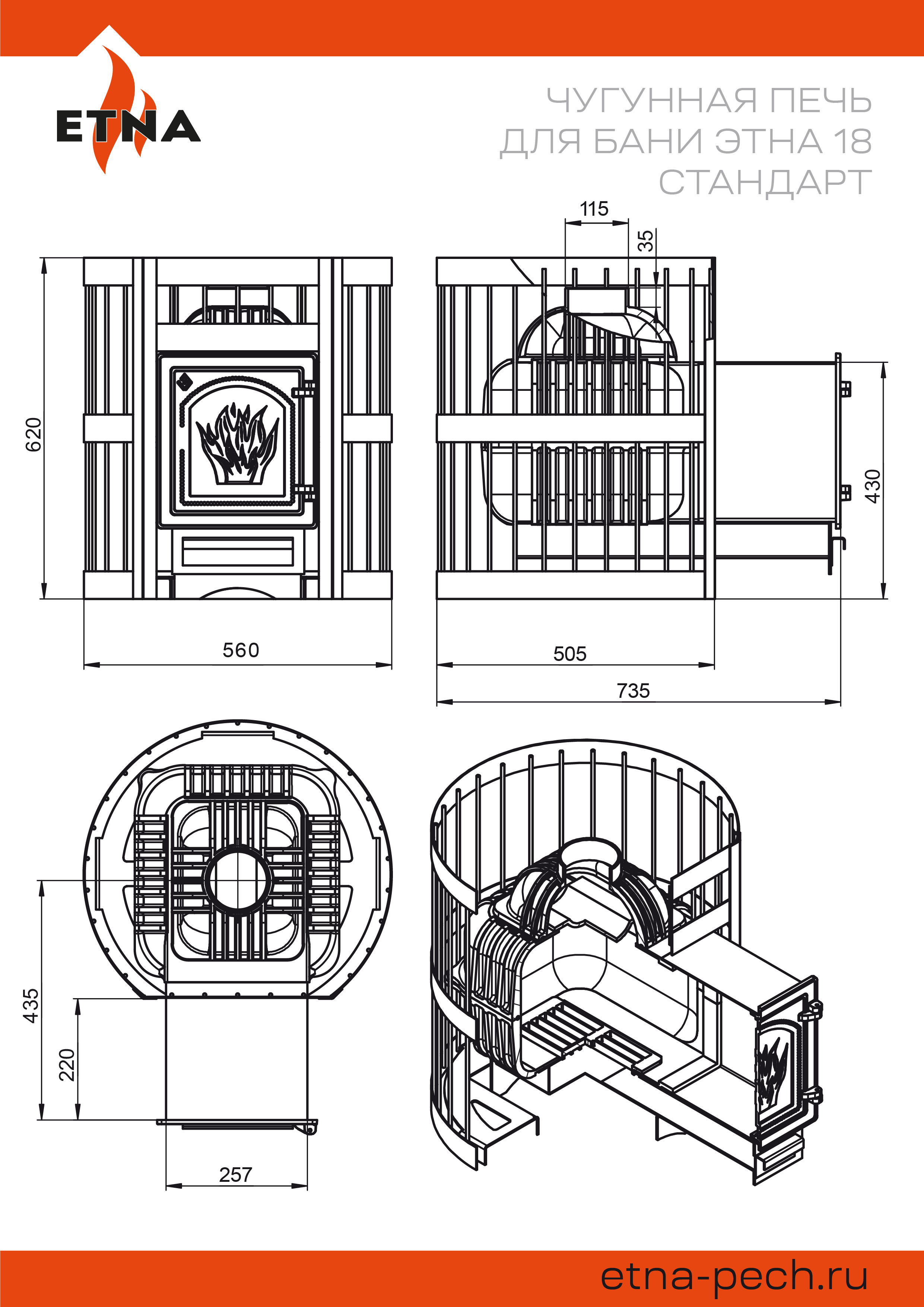 В нижней части топочной камеры размещается чугунный колосник, предназначенный для подачи воздуха на дрова снизу. Для повышения теплоотдачи и максимального использования энергии горения дров в верхней части печи расположен пламегаситель, изменяющий направление движения дымовых газов и обеспечивающий полное сгорание. Чугунная деталь перекрывает прямой путь пламени и газов в дымоход, что улучшает тепловые показатели печи ЭТНА 18.